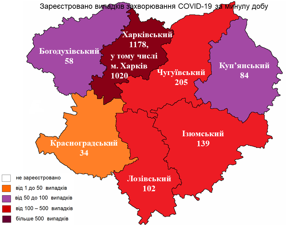 Діагноз COVID-19 удалося підтвердити у 205 жителів Чугуївського району, 139 –- Ізюмського та 102 – Лозівського районів. Крім того, 84 випадки захворювання в Куп'янському районі, 58 у Богодухівському та 34 у Красноградському районі.