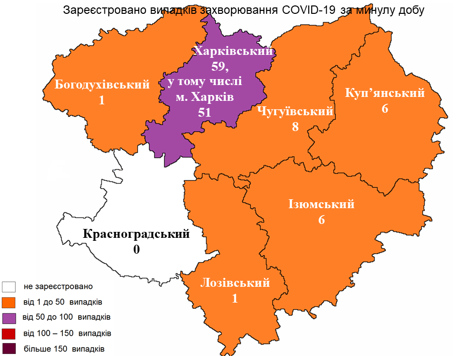 8 захворілих – мешканці Чугуївського, по 6 - Ізюмського та Куп’янського, по 1 – Богодухівського та Лозівського районів.