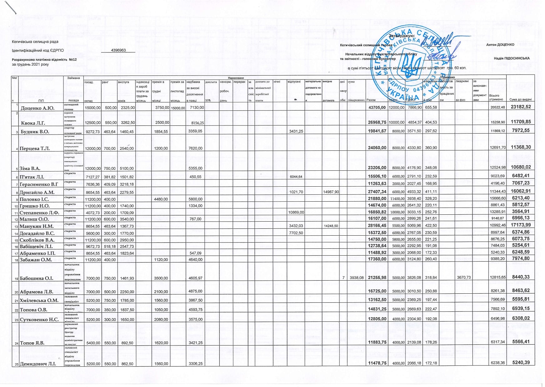 Отримати найбільшу грудневу зарплату вдалося селищному голові Доценку – 35 тисяч 182 гривні. А понад 23 тисячі гривень отримав староста Скобліков – 23 тисячі 649 гривень.